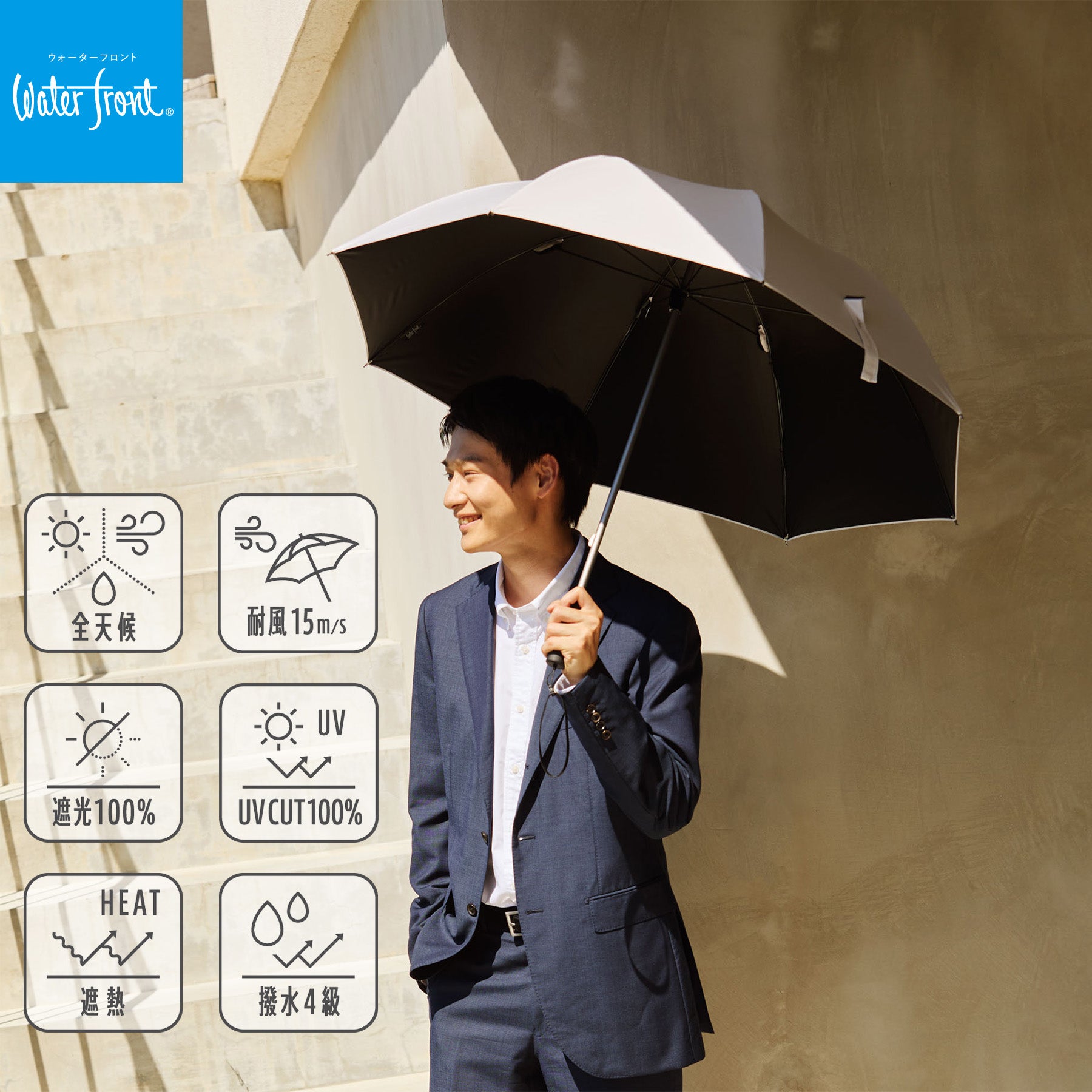 Introducing an all-weather umbrella that protects you from the sun, rain, and wind.